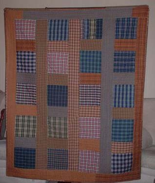 | Design Source - Description | These homespun fat quaters were bought in Houston 2003. Each nine inch block was quilted and then attached to the quilted sashing. This quilt as you go pattern was really easy to complete and my husband loves it. |