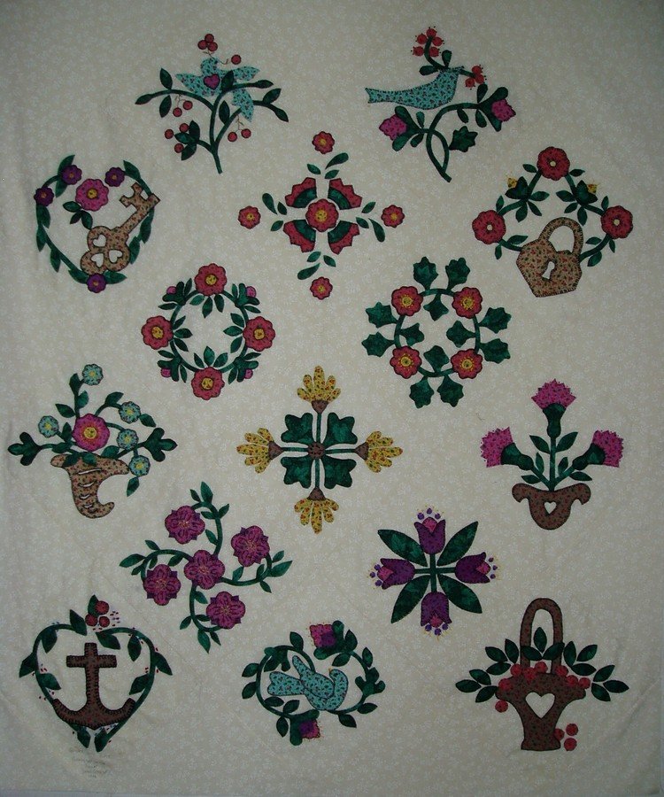 lmnterry Friendship Quilt - Except for background and vines/leaves, only one fabric used. Divided and dipped pieces of same "ugly" calico in different dye pots during class - all used in this quilt.