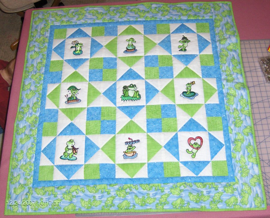 | Design Source - Description | Embroidered frogs are from Artistic Threadworks. Used EQ6 to draw the quilt, most quilting is stitch in the ditch but got a little braver this time using my new BSR to stipple quilt some of the colored squares. |