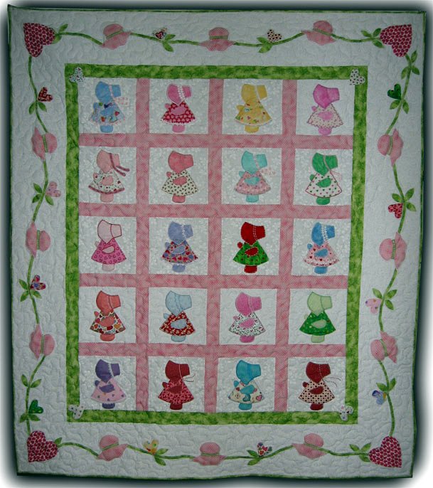 NanaAnn Elegant Sue - My Mother made a "Dutch Doll" quilt out of my little dresses when I was a small child. I traced over the pattern in the quilt and used my own idea as to how to dress each girl. I used heart material for their skits and solids for the other accessories. I used machine embrodiery and other types of embellishments