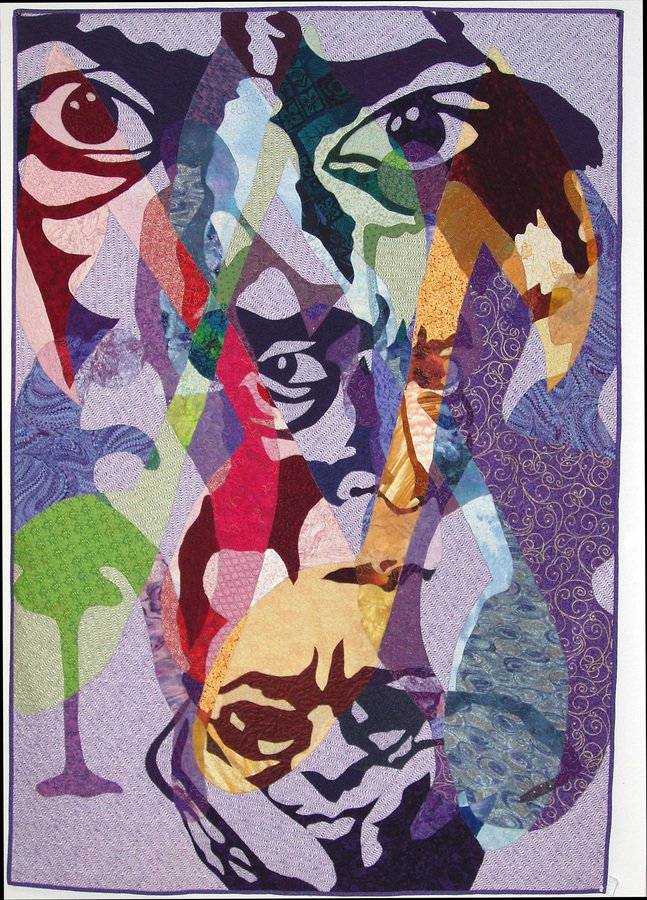 docpc Fascinatin'Rhythms - Three layer quilt in Katie PM's "ghost wash" style . Three musicians faces overly a quartet of jazz musicians playing piano,horn, sax, and bass. The third layer is musical notes which provide the color changes that affect the values of the other layers