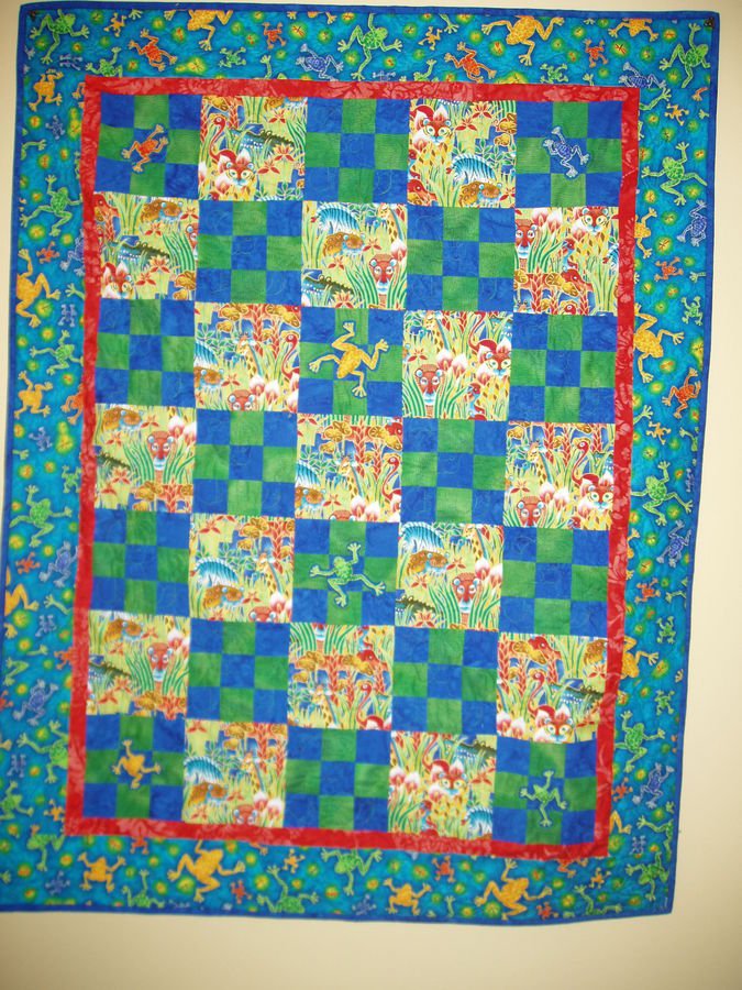 | Design Source - Description | Childs Jungle theme Lap Quilt with stuffed frogs on corners and centers |