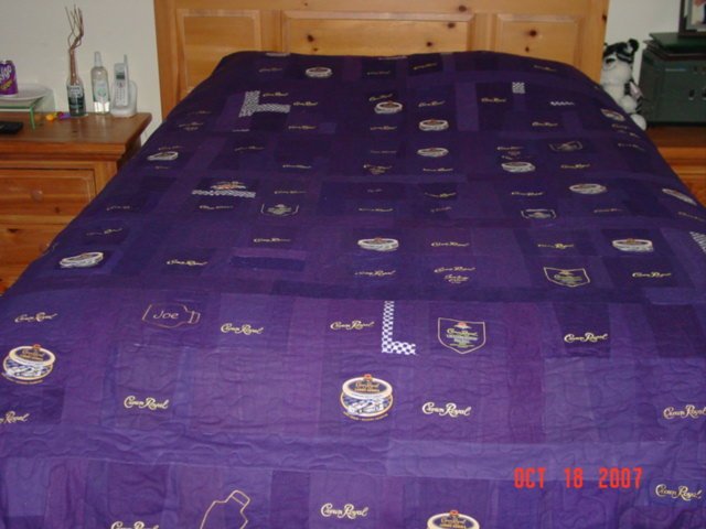cidly7 For Internal Use Only - A friend had all these crown royal bags and asked me if I could make him a quilt with them. So I did. It is a king size quilt. The top is made strictly of crown royal bags all pieced together into 6 inch squares. It was a long process of putting all of these bags together. When I presented him with his finished quilt and pillow shams I asked him what the name should be. He said that all that crown over the years was for internal use only, hence the name.