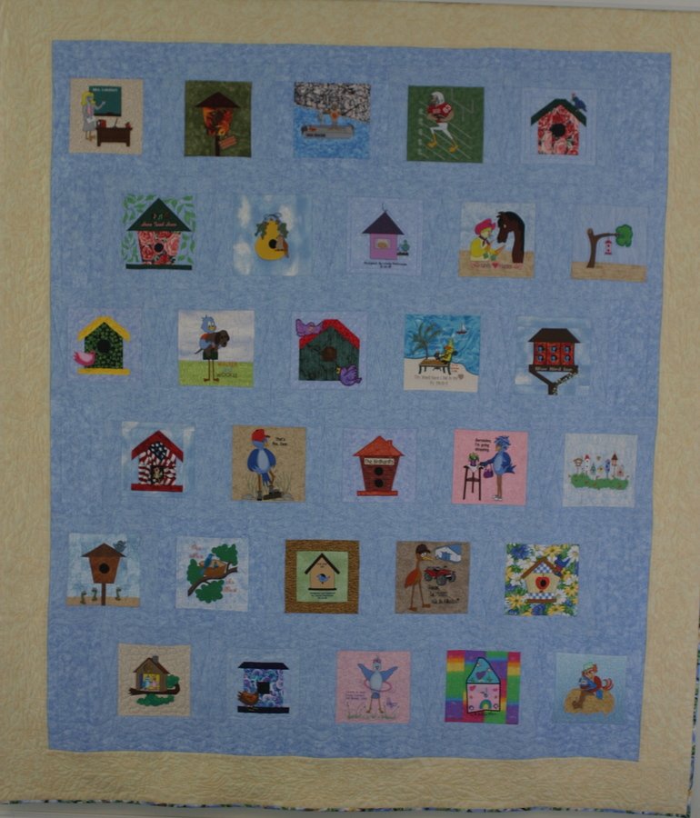 FrammaJoy The Birdhardts - I started out learning to paper piece birdhouses. Decided to add some machine embroidery with my Artista software. Grandchildren wanted to "help" so I told each of them if they would draw a birdhouse that I would digitize it and make a block with it, which I did. Later, I decided we needed to have some birds to live in the birdhouses, so I digitized birds to represent each member of the family. This quilt is a treasure to me, but I'm sure rather strange to anyone else, lol. I learned so much doing it and it was one of the first quilts to be done on my Millennium longarm purchased in June of 05.