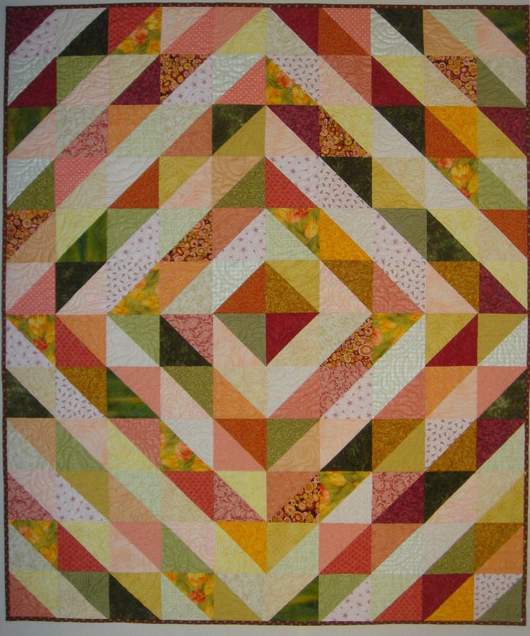 mknavy90 Flowers for Mary Ellen and Eileen - I needed a simple project to work on that I could pick up at any time, sew at any time, etc. So I started making half square triangle blocks in my Mom's favorite colors - peaches, oranges and a little pink. After putting a bunch of blocks together, I assembled this quilt thinking that my Mom could use a good lap quilt for cold days in Minnesota. I had almost as much fun assembling the back - for which I found a material that looked almost exactly like the drapes that hung in my Grandmother's (my Mom's Mom) dining room. Not only did it match her drapes, but it also contained geraniums (one of her favorite flowers). I also found a maroon and green polka-dot fabric that I would have NEVER picked out for my stash, but seemed to be made for this quilt - it became the border on the back and the binding! So without the original intent, this quilt contains the favorite flower colors that my Mom and Grandma loved. What a perfect combination!