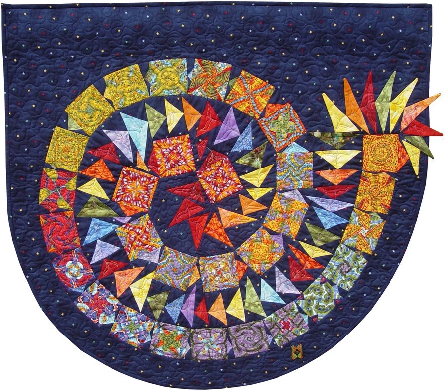 | Design Source - Description | My first Hoffman Challenge entry. My first paper piecing. Follow the geese "arrows"...you'll see there is no end to this evolutionary cycle. The 3D "rooster tail" geese were a fun experiment. |