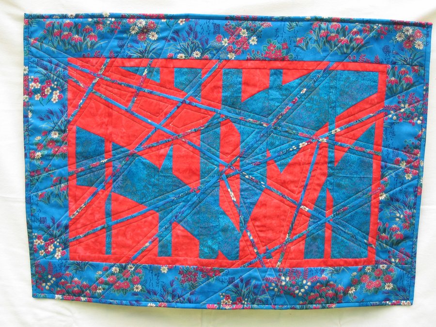 peggiyac Every Which Way - Every Which Way is a convergence of two bright batiks that work with the flower print that frames it. The hand appliqued bias bars draw the eyes in many directions. This quilt has hung in the Schweinfurth Gallery in Auburn, NY, and the Radius Shop in the Pennsylvania State Museum in Harrisburg, PA after its debut in the 2004 Exhibit of the Mountain Laurel Quilt Guild in Wellsboro, PA.