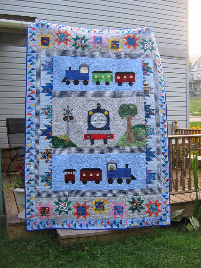 peggiyac Jonah's Train - My grandchildren get a quilt when they move from crib to 'big bed'. This quilt for Jonah incorporates his picture as the engineer of the bottom train. The quilt grew organically as disparate elements fit together with black and white checks.