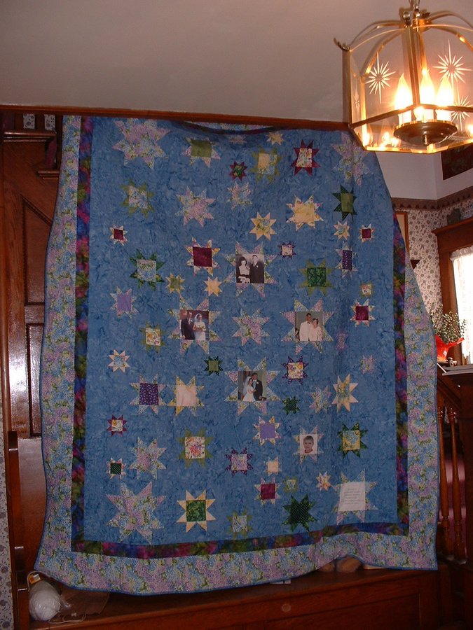 peggiyac 60 Years Together - This quilt was a 60th wedding anniversary gift to my in-laws from the family. It has 60 stars of various sizes and fabrics. The four center stars have wedding photo centers showing my in-laws, their 2 sons' weddings, and their one grandson's wedding. A small photo in the lower right shows their one great grandson.