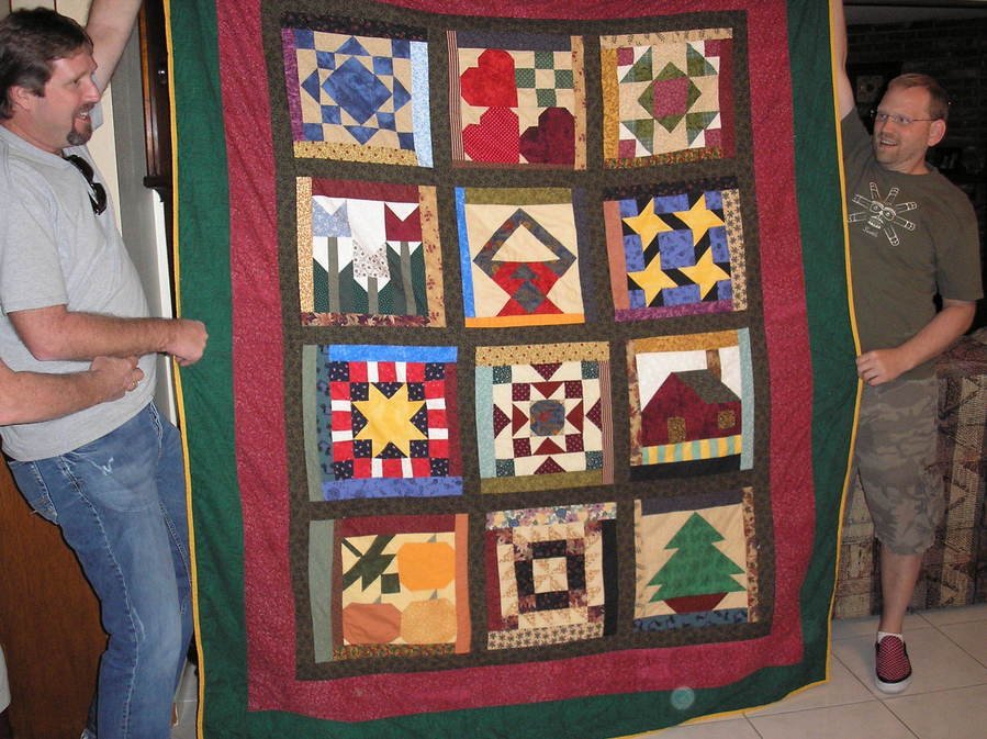 khwoman Twelve Month Quilt - This was a fun quilt to make. My 12 inch squares aren't 12 inches. some are bigger, some are smaller. I made this from scraps out of my bin, just kept digging in there to fine the right fabric. I have this on the bed in our guest room. The guest love it!!