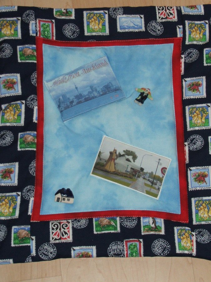 Pigletworld Postcard Wallhanging - This was my first quilt, I purchased the Kit from Kwik Quilts in New Zealand The centre is photo fabric which I printed two pictures I had taken on my holiday to Auckland to visit my Sister and brother then added some buttons the border in wonderful New Zealand stamp Fabric.