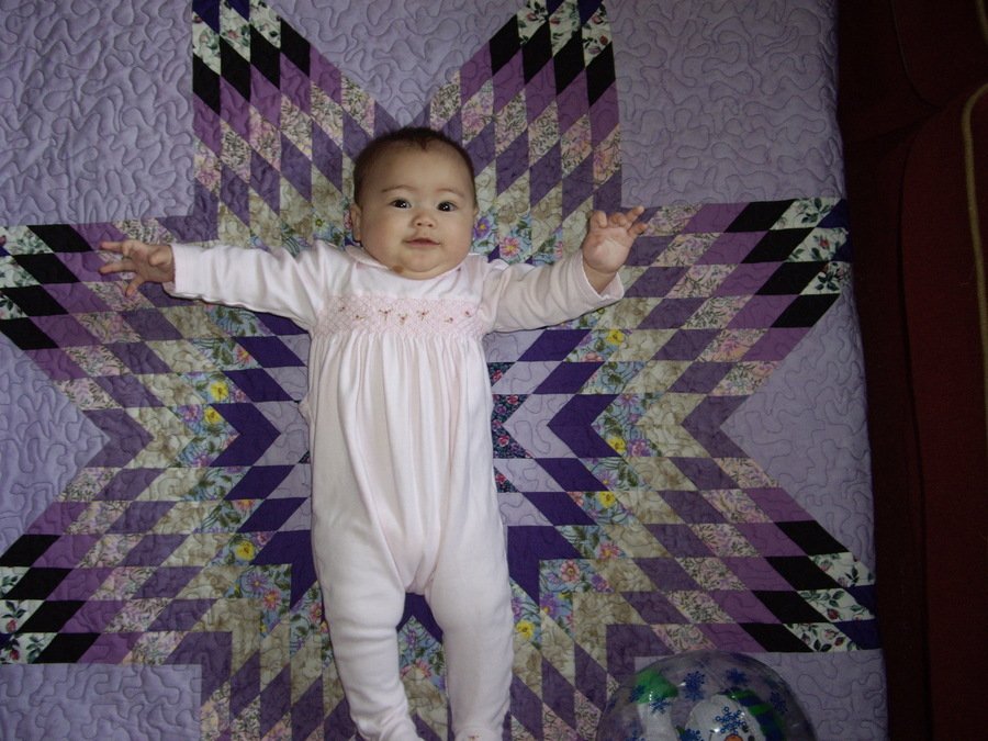 whisperingpines Torrie's Star - This baby quilt was for my daughter's friend & co-worker who recently had a baby girl. It has 13 colors in the Star itself. My daughter and I chose the colors to hopefully accent baby Torrie's bedroom. I machine quilted it. It measures about 50" X 50". It has four hundred pieces of various colors of purples, baby blues, beiges, pinks, whites, yellows, and black on a lilac background.
