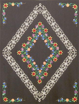 | Design Source - Description | The white celtic design was appliqued on the background first. Over 200 dimensional flowers were made for this quilt, but after auditioning them I ended up using only about half of them on this quilt. |