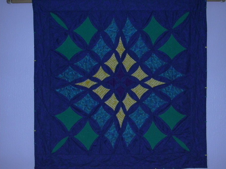 | Design Source - Description | A wall hanging based on Distorted Cathedral Window as demonstrated in Lynne Edwards book combined with Fibonnacci's formula, inspired by the colours seen in a watercolour of Iris's. Textured inserts inside the "windows". |