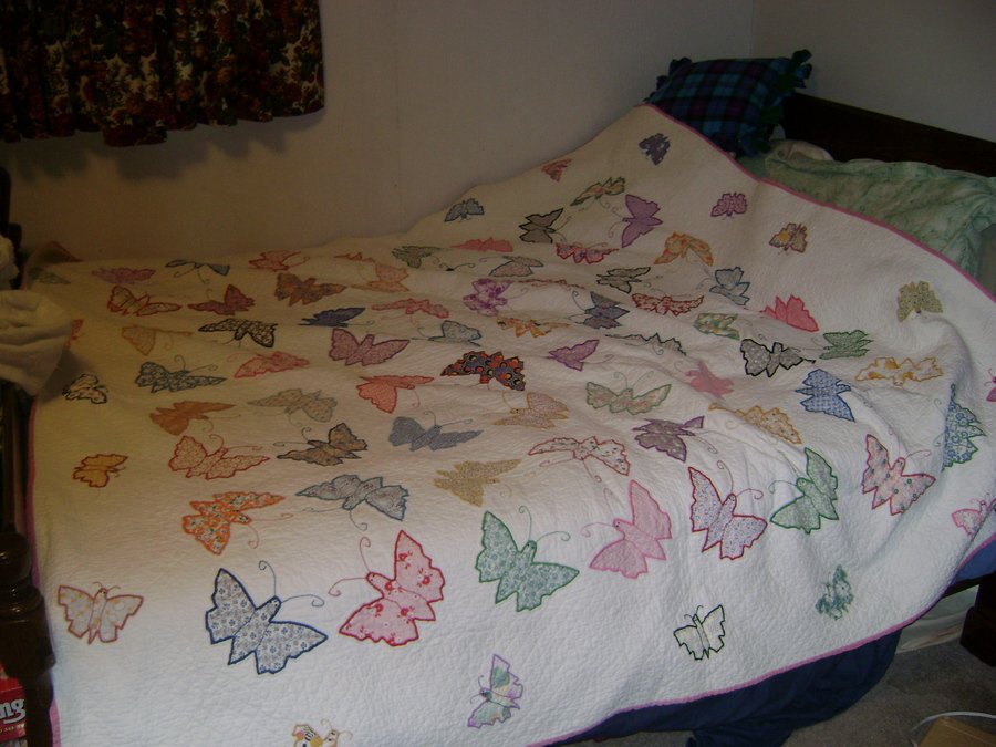 PennyBowser The Twins - These are a pair of quilts that I purchased at my friend's shop - Donna Bacon in Kennett Square, PA. I love these quilts -- I call them the twins. The quilting is superb! The butterflies are hand appliqued with hand satin stitching.