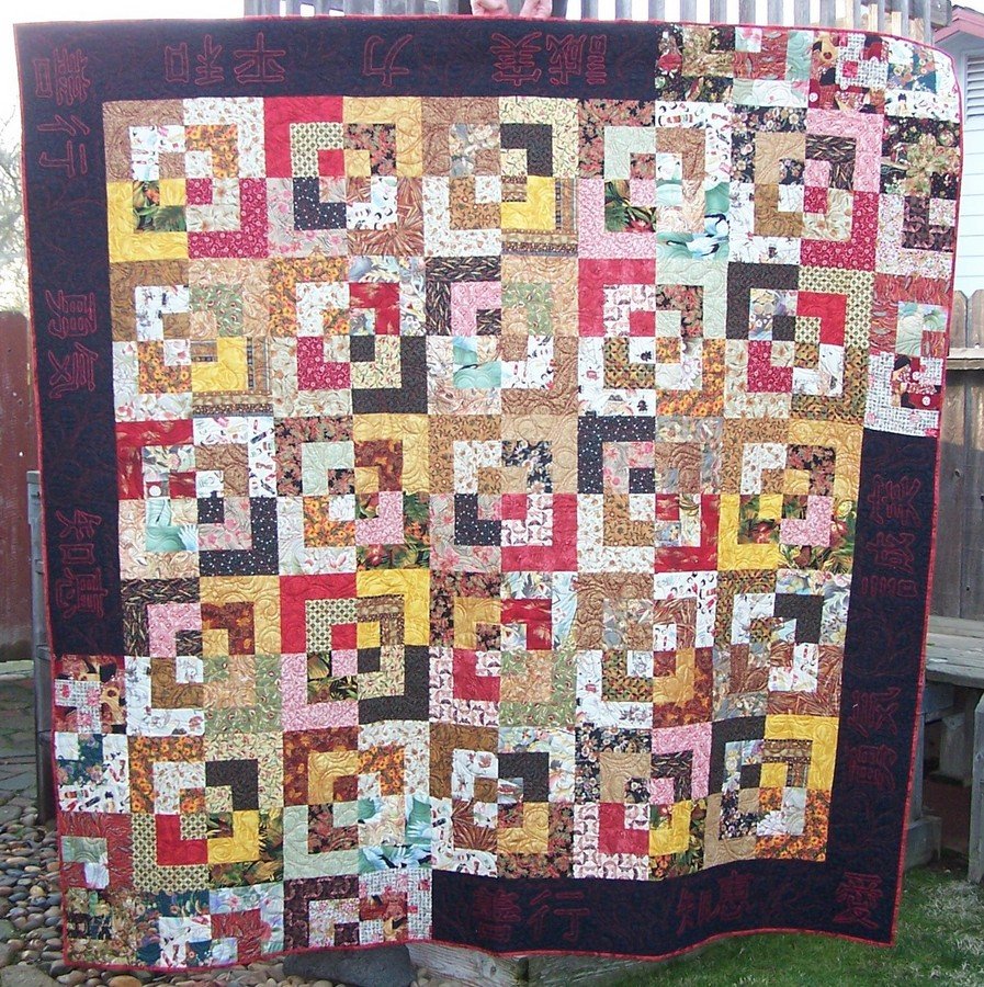 kheystee Kathy Heystee - I used the Bento Box pattern and then designed my own borders. The quilt is done in asia themed prints. The borders have words in Chinese using red embroidery floss. The quilt is quilted with red thread and the Chinese words are interpretted in English in the quilting. I was very excited that one of my Chinese friends could actually read the words I had in embroidery.