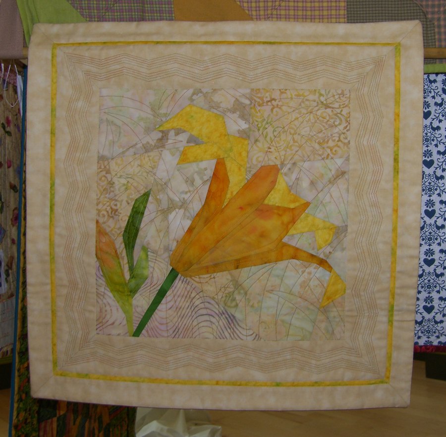 Ch3ryl Yellow Daylily One - I love Ruth McDowell's designs and fabric choices and I enjoyed learning and practicing her piecing technique so much, I made three of the daylilies from her book, Pieced Flowers. Here's one of them.