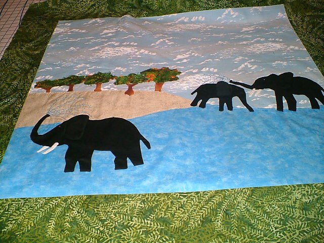 slozano Elephants for April (working title) - This wall hanging for my daughter is not yet quilted, but soon it will be. This pattern appeared in Applique Quilts as two wall hangings, and I have combined them into one wall hanging.