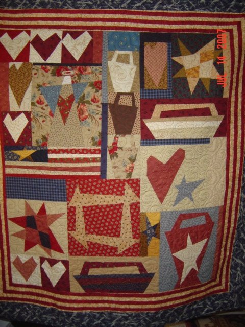 lguajardo Crazy Among Friends - A group of friends would get together, pick out a pattern and each one would do a block for the other. When finished, we would put the blocks in paper bags and then we would all select from a block from each one. The only rule we had was to use the same color scheme. Each month we would meet and have a show n tell. It was up to us to put the blocks together and quilt. This was so much fun and we all ended up with a full quilt.
