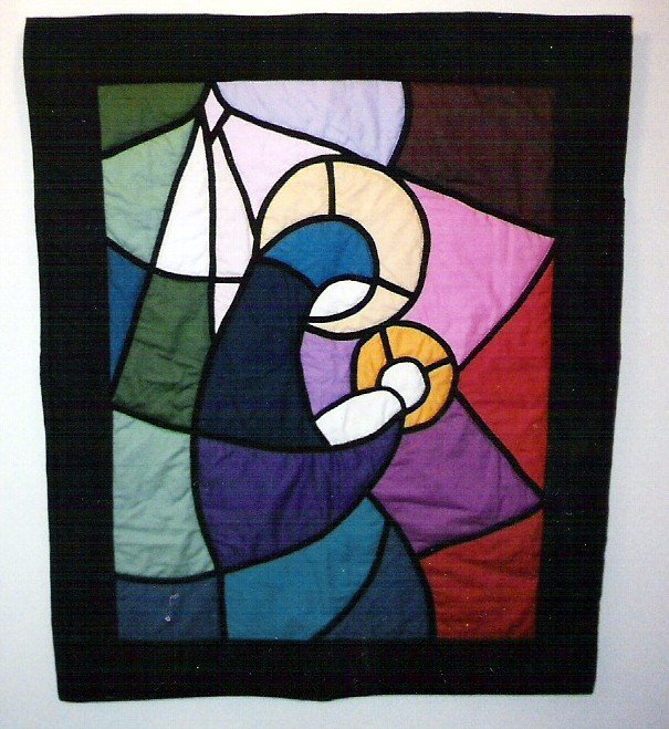 Stitcher Madonna and Child - I purchased the kit for this hanging in Florida many years ago. Took me quite some time to complete. Kit contained fabric, photo and drawing of the design. No directions. I muddled through using purchased bias tape, I have since done "stained glass" with the iron on "leading" and much prefer the look of the regular bias even though it takes longer.