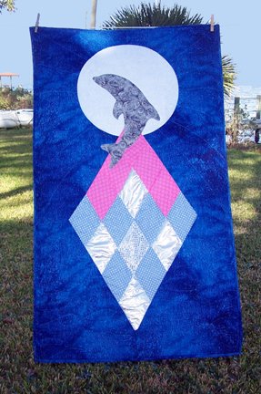 SandiMako Dolphins Are A Girl's Best Friend - Every year Quilters By The Sea sponsors a challenge with unique fabrics. This year the theme was "Diamonds are a Girl's Best Friend." It reminded me of the sparkling diamond patterns that the full moon makes on the river at night as the dolphins play.