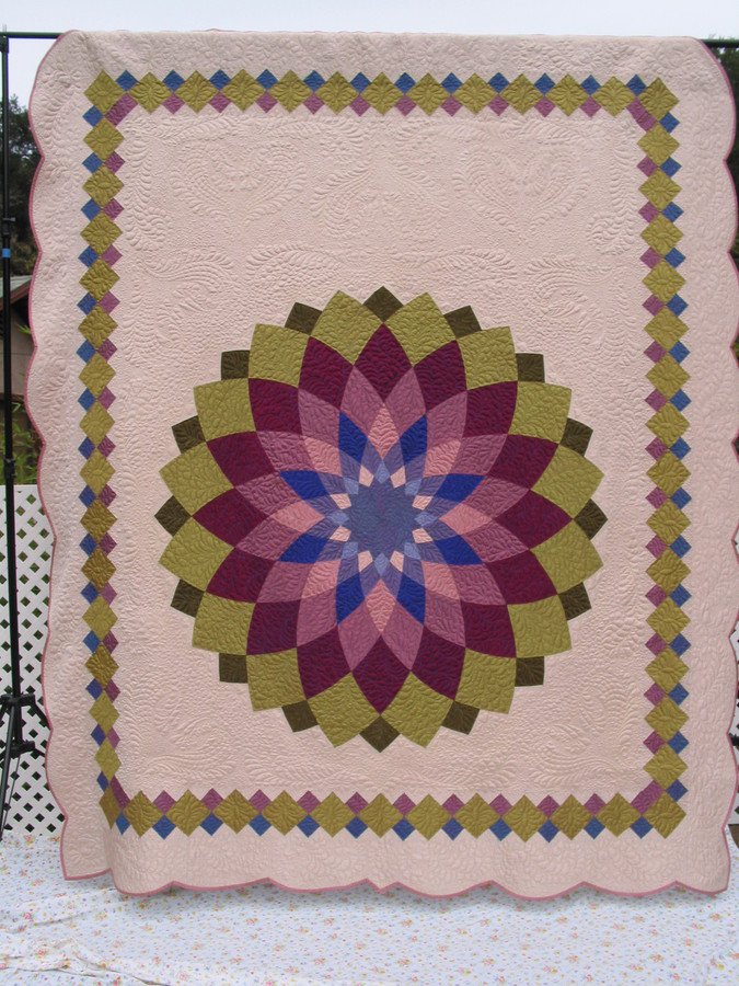 latpatt Champagne Dupioni Dahlia - I wanted to make a silk quilt using dupioni, this was quite a challenge, I fused the center dahlia pieces to keep them from fraying. The marking and quilting took 4 months. I adapted feather designs to fit each petal in the flower and used varigated King Tut thread to enhance the colors, each flower round used a different color of thread and design. I then marked the background quilting using a light table. I wanted the hearts to align on the pillow tuck. A wool batt was used to add to the design puff, I tried a sample piece using trapunto, but it was too difficult to cut away the batting, I kept cutting holes into the silk. The quilt was juried into Road to California 2008.