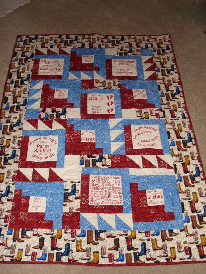 NadineQuilts Jayden's Cowboy Quilt - This is an unusual fabric choice for a baby quilt, but we live in the "West" so I chose cowboy fabrics, like boots and bandanas for Jayden. While his mom was pregnant with him, we all had a big cowboy cook out and party at a resort in AZ, so it seemed fitting.