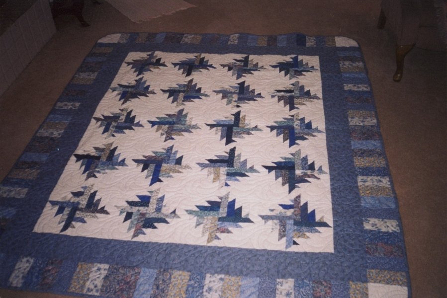 | Design Source - Description | This is a totally scrappy Cactus Blossom in all blues. It was a lot of fun to make and use a lot of different fabrics. I used a piano key border (I love those) and rounded the edges for fun. |