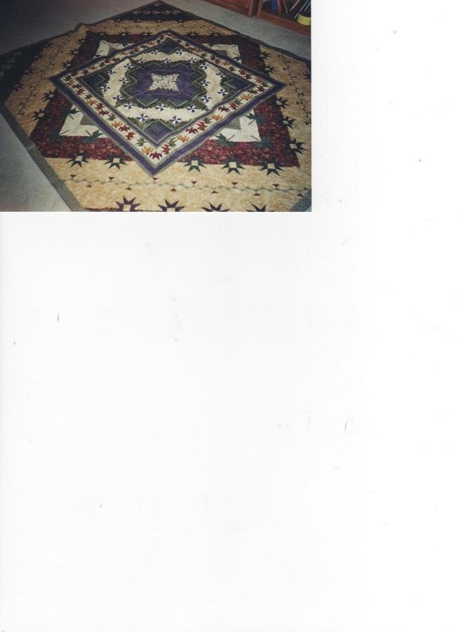 NadineQuilts Stephanie's Harvest Song - This was one of the most interesting and difficult quilts I've ever made and one of my two favorites. It has many 3-Dimensional parts and taught me many different blocks and techniques. The fabrics are Benartex, and I used a purple one from the collection for the backing. It is a king size. The quilting is free hand by Sharon Brooks and she is truly an artist. She made it even more special by her talent.