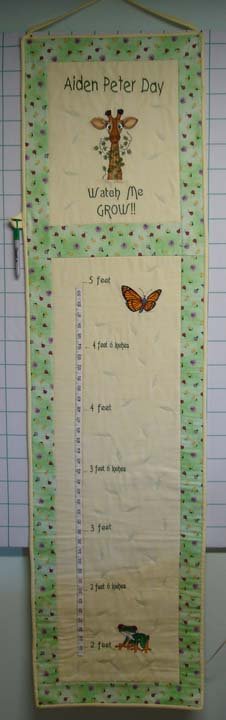 sewmanyquilts Baby Growth Chart - This is a baby Growth Chart, using the Whimsical Kingdom embroidery designs. It features a giraffe at the top, a butterfly just below the giraffe, and a frog at the bottom. There is a measuring tape marked off with feet, and falling leaves quilted into the background.