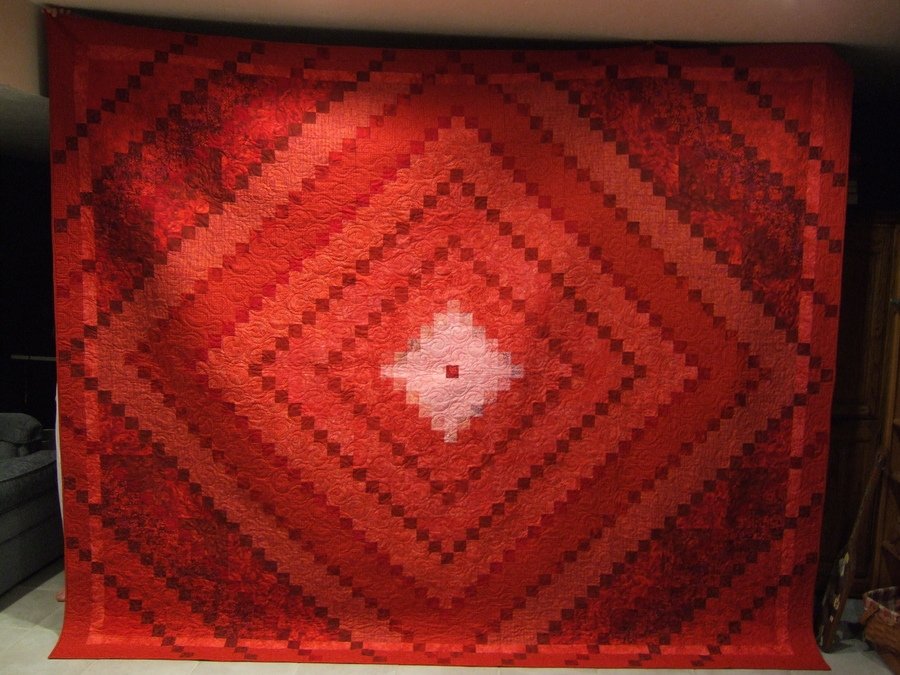 Casey Trip around redville - This pattern was done in wall hanging size and I was making a queen size quilt. I purchased over 25 red fabrics to complete the quilt. I found that trying to use those many reds meant my selection either went toward red orange or burgundy. It was really hard to find a selection of reds that stayed the true cherry red I was wanting to use. It went together like a charm - just one block required ripping because of my inattention.