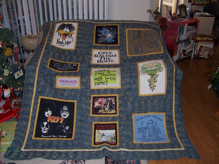 | Design Source - Description | My 22 year old son moved out last year and left behind a box of t-shirts. I picked out his favorites and put them together on this quilt. I backed it with warm flannel and gave it to him for Christmas. |