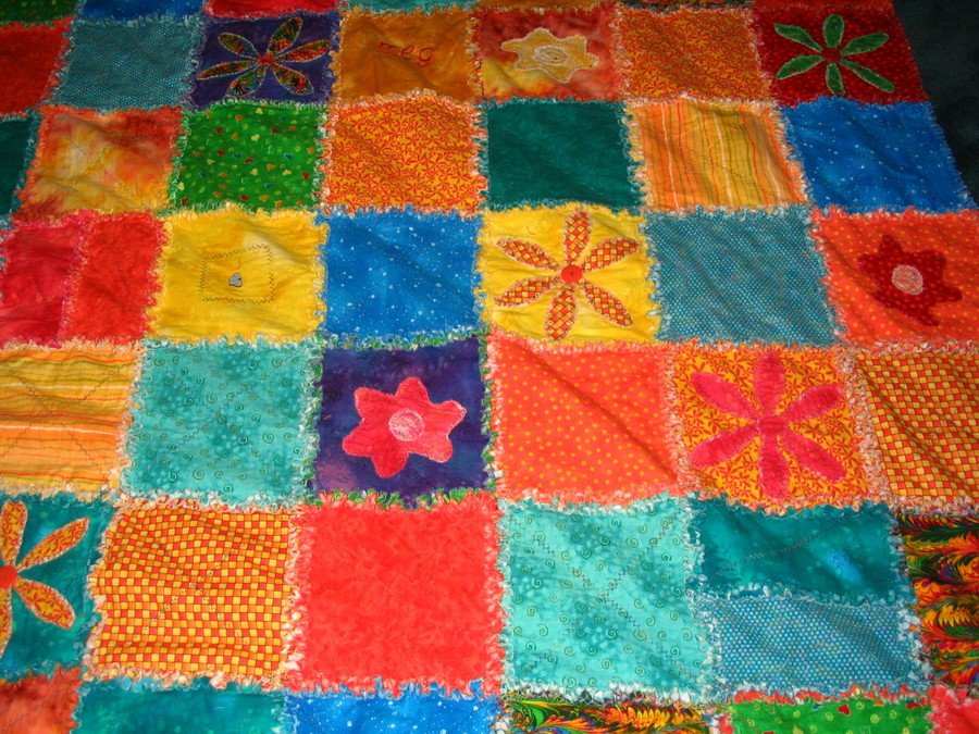 | Design Source - Description | Bright colored flannel fabrics and flannel appliques used to make this rag quilt. |