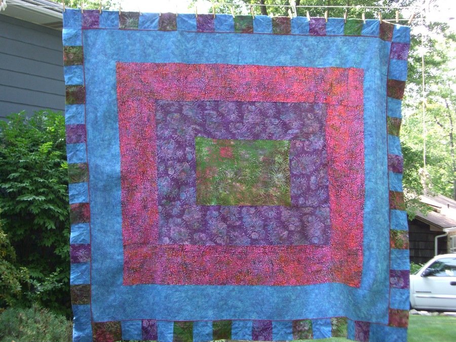 lcarolyn perfectly imperfect - i wanted this anniversary gift for my daughter and son-in-law to stand on it's own, and i wanted the batiks to stand out. the jewel-like colors are brilliant and the designs with-in each color are mesmerizing. red piping was added between the turquoise and the outer border of blocks. this is a king size quilt with quilting every 1/4", consequently it is quite heavy.
