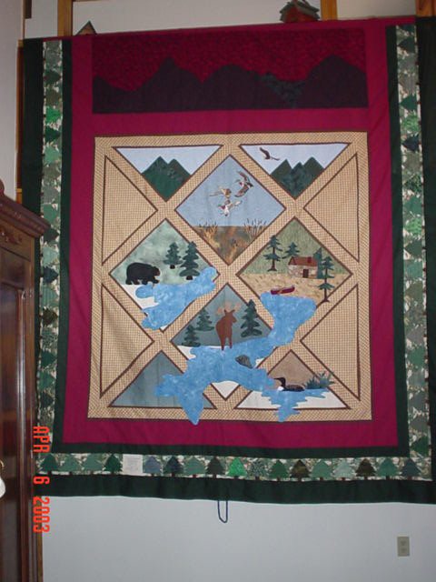 | Design Source - Description | pieced, paper-pieced, fused & needle-turn applique mountain scene with the Adirondack hipeaks silhouette appliqued to make pillow portion. machine quilted. |
