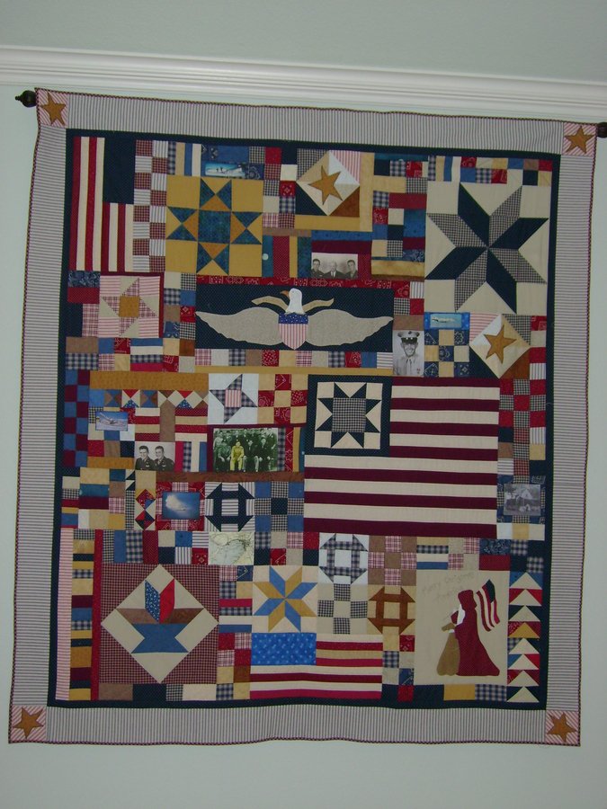 Enice And They Waited - I made this quilt for my husband who served as an F-4 pilot in the Marines and in honor of his uncle Jack Burke and his father Robert Burke who were a B-24 pilot and B-29 bombarider in WW-II. Jack was shot down and lost at sea in Kobe Bay, Japan on March 17. 1945. St. Patricks Day. There are several pictures incorporated in the quilt of the air planes that each man flew, of each of the men, their family home, Jack's crew (that were all killed that day) and even a map showing where they were shot down. I used home spun and regular cotton. The designer of the quilt is Veda Wilhite. I had to make a few changes, but her book is great.