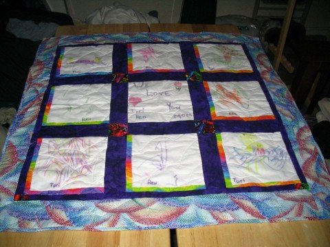 lucyvanpelt we love you mom - blocks made using crayola fabric crayons with original artworks by tori and ren set with cornerstones and sashing