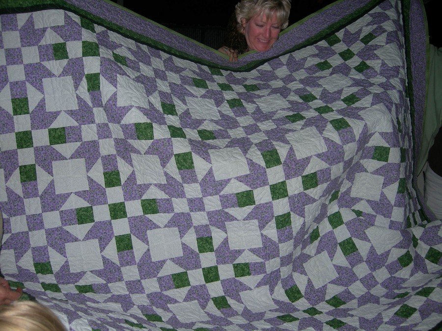 Ouida Sister to Sister - My Sister was the only family member I had not made a quilt for. She was coming to Oregon for a visit. I saw this pattern in a book in different colors and I Know this was the One.. She likes Purples and Greens. My friend has a long arm machine and offered to let me try it. Ohh what fun I had, This was my first and hopefully not last experience with a long arm machine..
