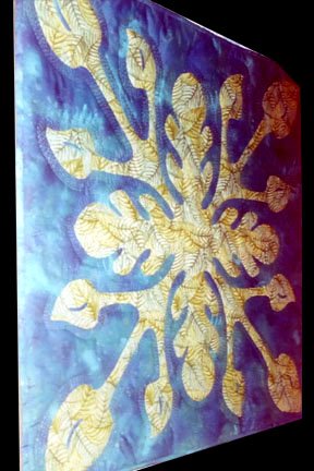 PattiSure Carl Wishes He'd Been in Hawaii Instead - Carl, my seat partner at work at the time accidently burned his house down. To make matters worse he was home because he got bumped off a flight to Hawaii (we work for an airline reservation center). He looked like a lost little boy telling the story to folks. So we organized an auction/book/bake sale to help out. This wallhanging was auctioned off in the sale. Another quilt started in a Paula Golden class.