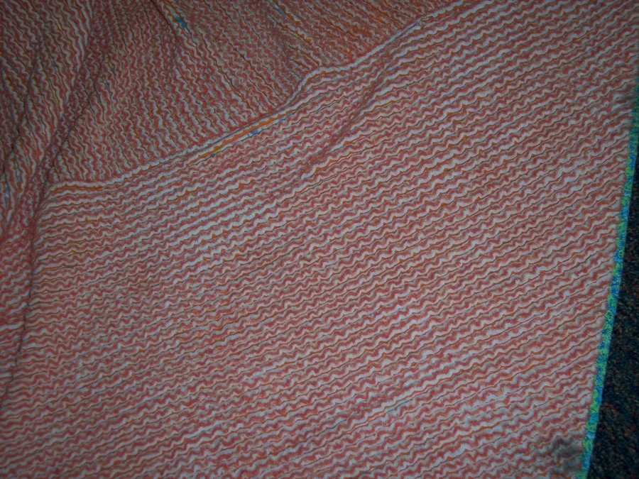logcabingrandma Indi's Quilt - I have taught Chenille Classes for our local quilt shop. This is a simple five layer quilt. it has three layers of muslin in between two layers of heavy flannel. The top flannel is orange polka dots purchased at JoAnnes. The bottom is a bright floral purchased there also. The sewing lines are 1/2 inch apart. I sewed 1/2 in one direction and then the other half diagonal to that so that both were on the biaz. The binding is double fold regular cotton.