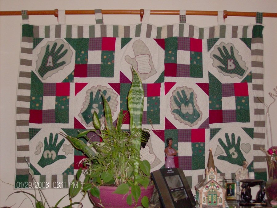 chilizee MOMMA'S HANDS - Serendipity was the way that this one came together. When my nana was living I traced her hands on a calender page along with my aunt and mother and hand appligued them to snow ball blocks. in their palms there is each member's initials. My brother wrote a poem that was printed on fabric and appliqued on oven mitts which was a family joke cause Nana and the mothers never used them. Our generation always did. There are two of these quilts that were made and now that Nana is gone they are very special. My mother lives with me so I get to enjoy one.
