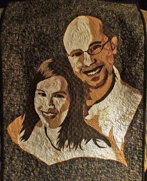 | Design Source - Description | Using the technique described in "Fabric Photo Play" by Julia Wood, I enlarged and translated a photograph of my son and his new wife into a wall hanging. |