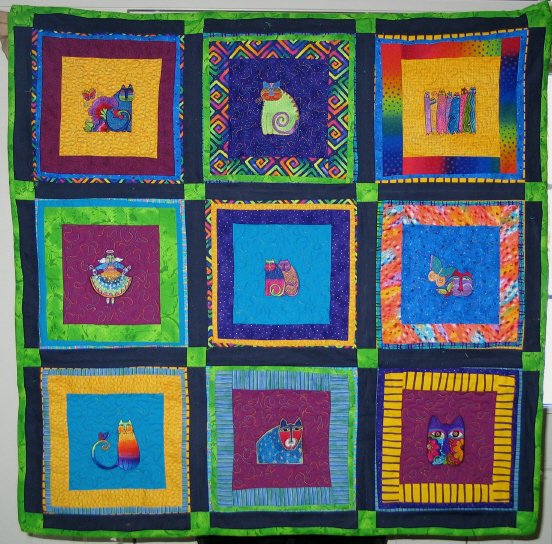 judyjudyjudy Laurel Burch Cat Quilt - The cats are all Laurel Burch embroidery designs. They are embroidered on 6" square pieces of fabric, then they have colorful borders attached. Then I free-motion quilted the entire quilt. I made it for my great friend Jhane Marello. I am fortunate to have met her 5 years ago, we are so close it is like having another sister. Last November we went out west to Best Friends Animal Sanctuary in Kanab, Utah. We also visited quilt stores in Flagstaff and Sedona. Jhane fell in love with a quilt with cats on it and went on and on and on about how much she would pay me to make a quilt for her. Little did she know that I had already made this quilt for her and that it was all wrapped up and ready for her to take home with her when we ended our vacation. I got such a kick out of it :) How luck to have found such a good friend. Love you Jhaney