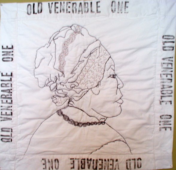 gypsycrone2000 Old venerable one - Contour drawing, machine quilted with rubber stamped lettering