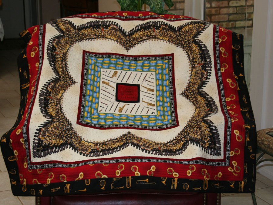 Grafgraf Issac's quilt - Issac's dad is the band director of Levelland High School Band - the Big Dawg's . So I used music fabric accentuating the motifs.
