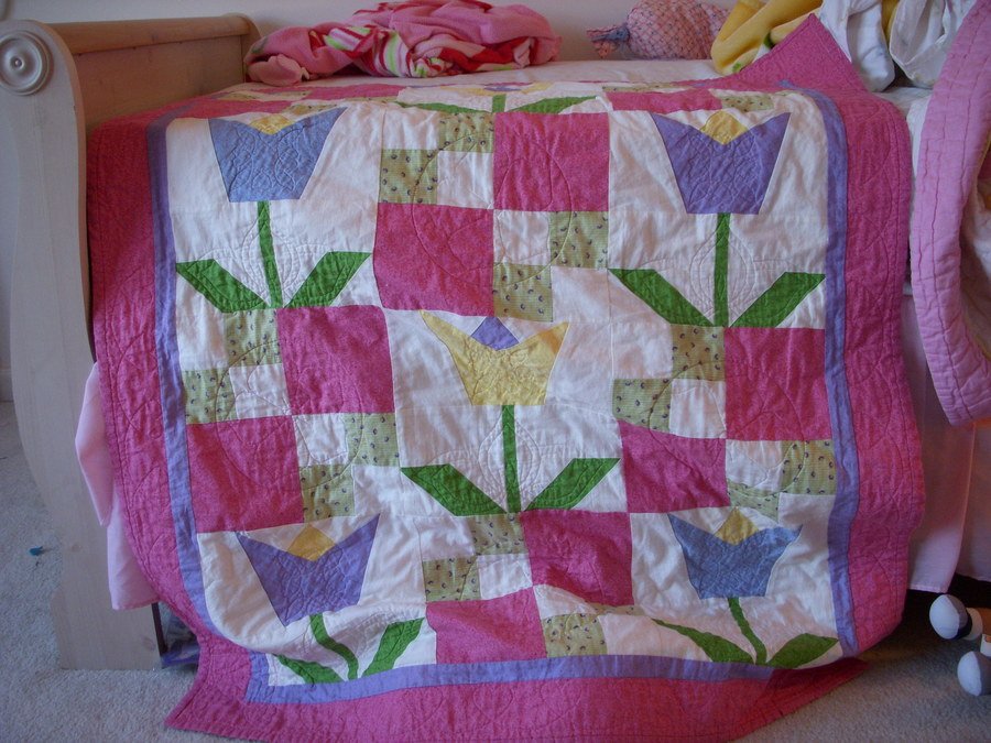 Fan4may Maddys Spring Tulips - I made this quilt for my daughter and had no clue how to adapt the pattern to the size I wanted. I believe I purchased 6 yards of the pink so you can say she has a few other projects with this pink fabric included.