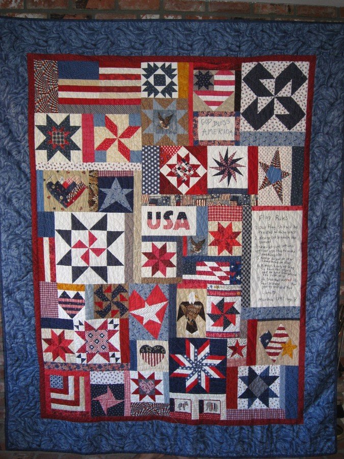 Robinlovesquilts Stars and Stripes Forever - I was inspired to make this quilt in 1997 with friends during a class we took in Palmdale, CA. Each of us made blocks and shared them to make our own quilt using our own setting. For several years this quilt top was put away and then with the events of 9-11-01, I felt the need to work on this quilt while watching the frightening events on TV.