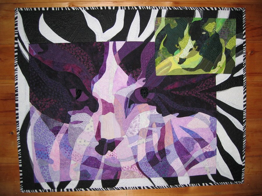 Wildyam Herb I & II - This quilt is the result of a workshop at the Allegre Retreat in 2004. Katie Pasquini-Masopust was the teacher. This is the best workshop I've ever taken and the result was better than I thought it would be! Design is derived from a photo of my cat, Herb. Herb has slept on this quilt, and is unimpressed by the ribbon it won. LME
