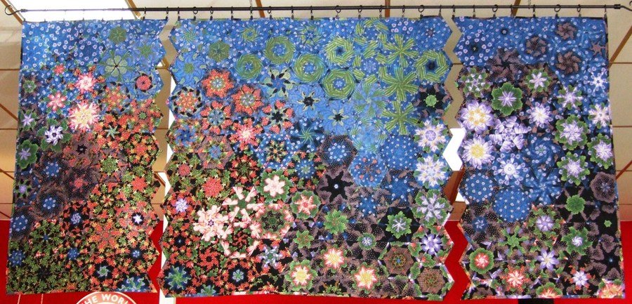 PamQSE One Block Wonder Triptich - Started with 2008 Hoffman Challenge fabric oriental in the blue colorway. Wanted a large impact but be able to hang it anywhere in my home so I came up the idea of the fractured triptich. The binding is fused. I quilted it on my Gammill Optimum with Statler Stitcher with spirograph patterns in blue and black metallic thread.