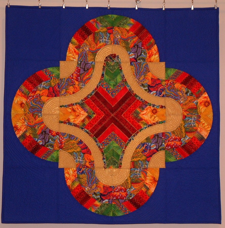 PamQSE Hoffman Jewel - Created with the 2004 Hoffman Challenge fabrics but not finished in time for the contest. :( Could not bring together a large enough design for the contest so it later evolved into this small jewel and came out so much the better for the wait. I have in hanging in my bedroom and I love it!